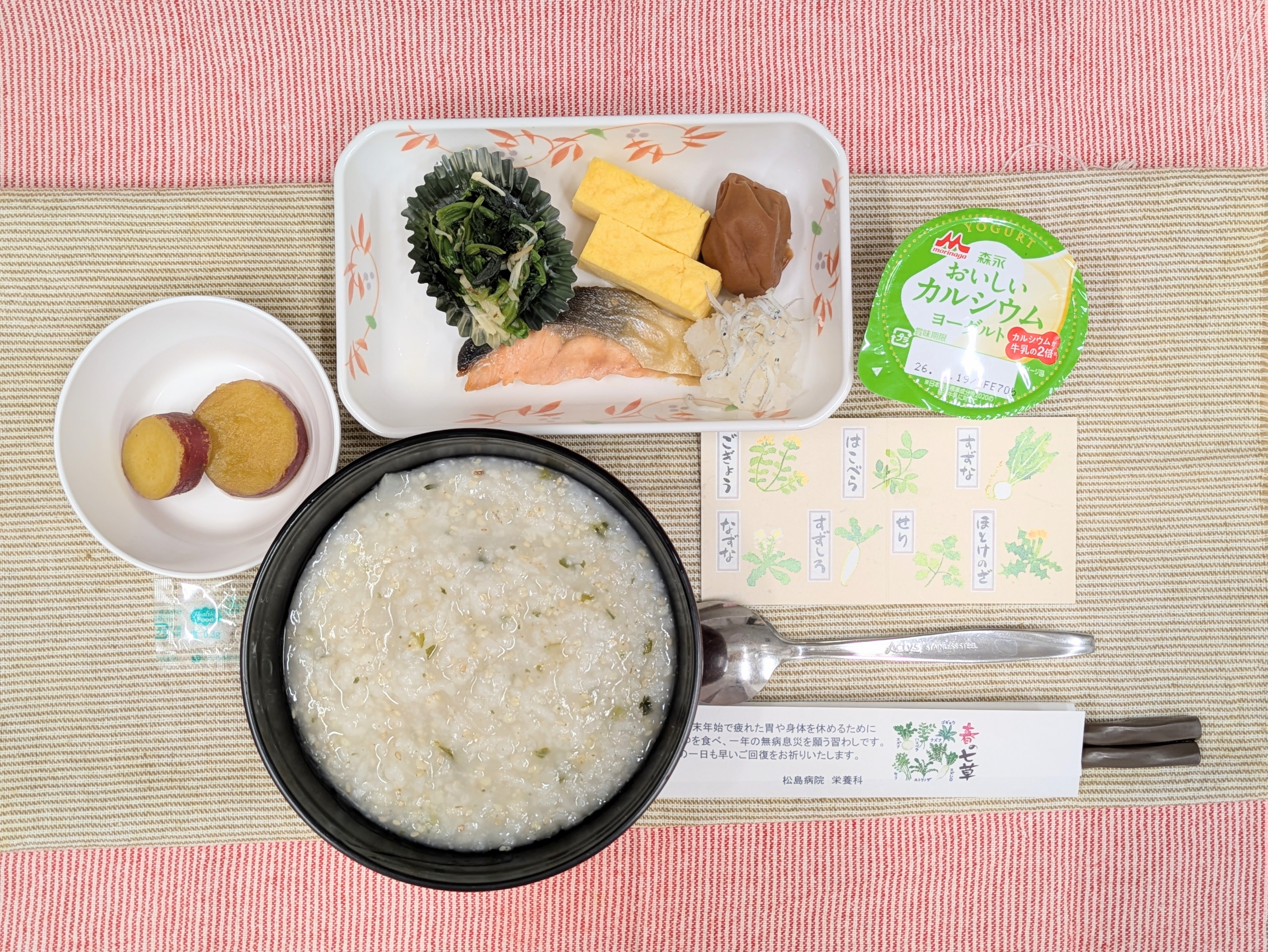 【 1/7七草(朝) 】五穀入り七草がゆ・薬味盛合せ(鮭塩焼き・厚焼き玉子・青菜のおかか和え・しらすおろし・梅干し)・さつまいも甘辛煮・ヨーグルト(エネルギー438kcal・食物繊維4.9g・塩分4.3g)