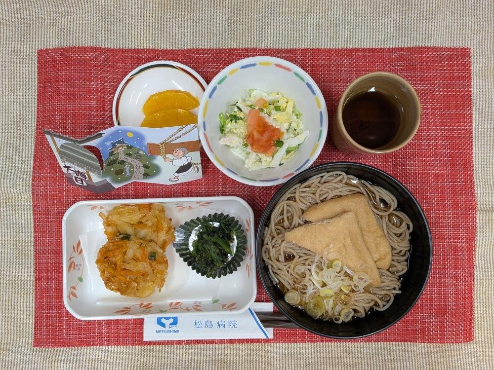 【 12/31大晦日(夕) 】年越しそば(味付き油揚げ)・かき揚げ・青菜のおかか和え・白菜サラダ・フルーツ(エネルギー569kcal・食物繊維9.0g・塩分3.1g)