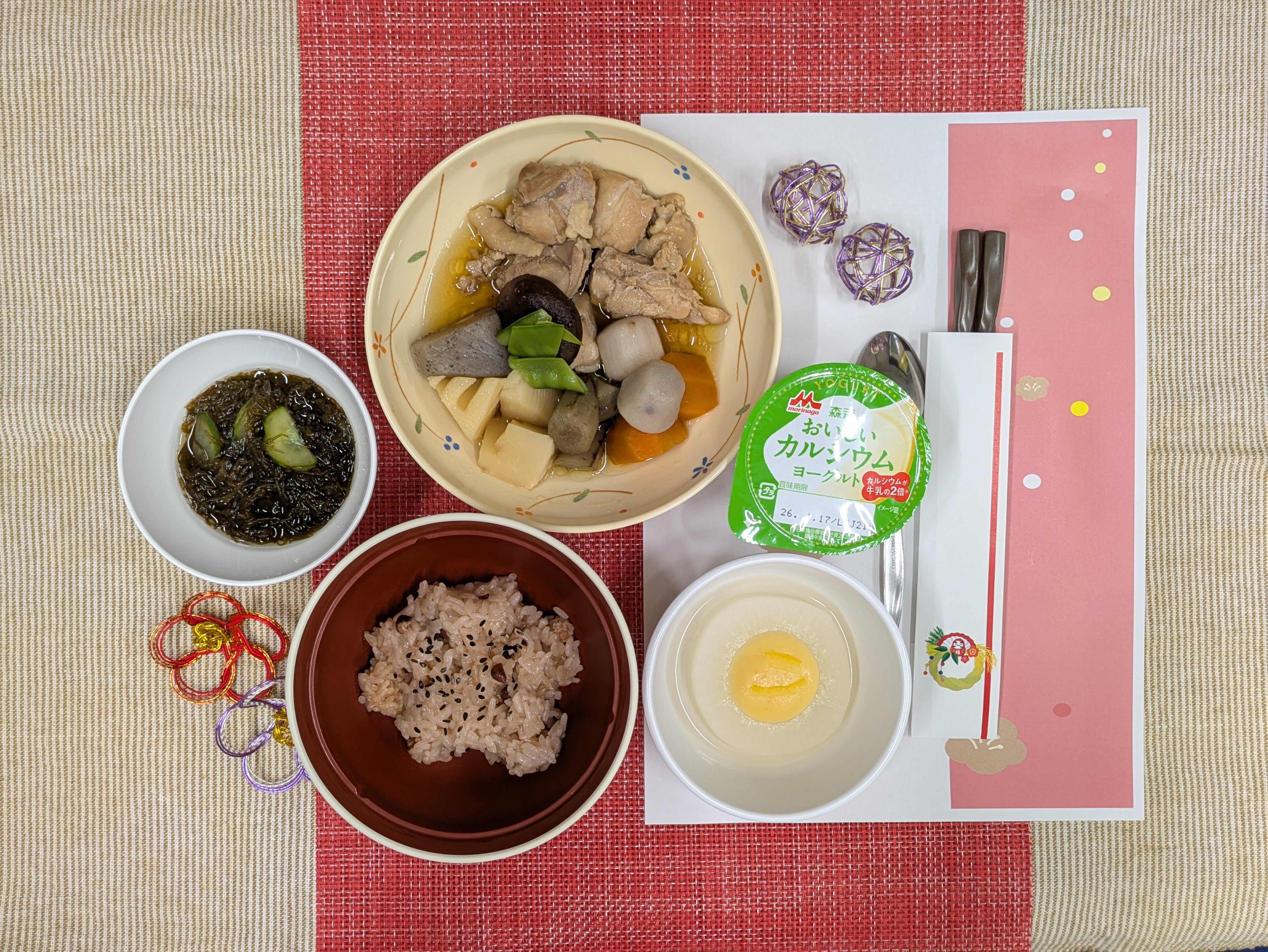 【 1/1(夕) 】赤飯・筑前煮・ふろふき大根・もずく酢・ヨーグルト(エネルギー644kcal・食物繊維8.1g・塩分2.0g)