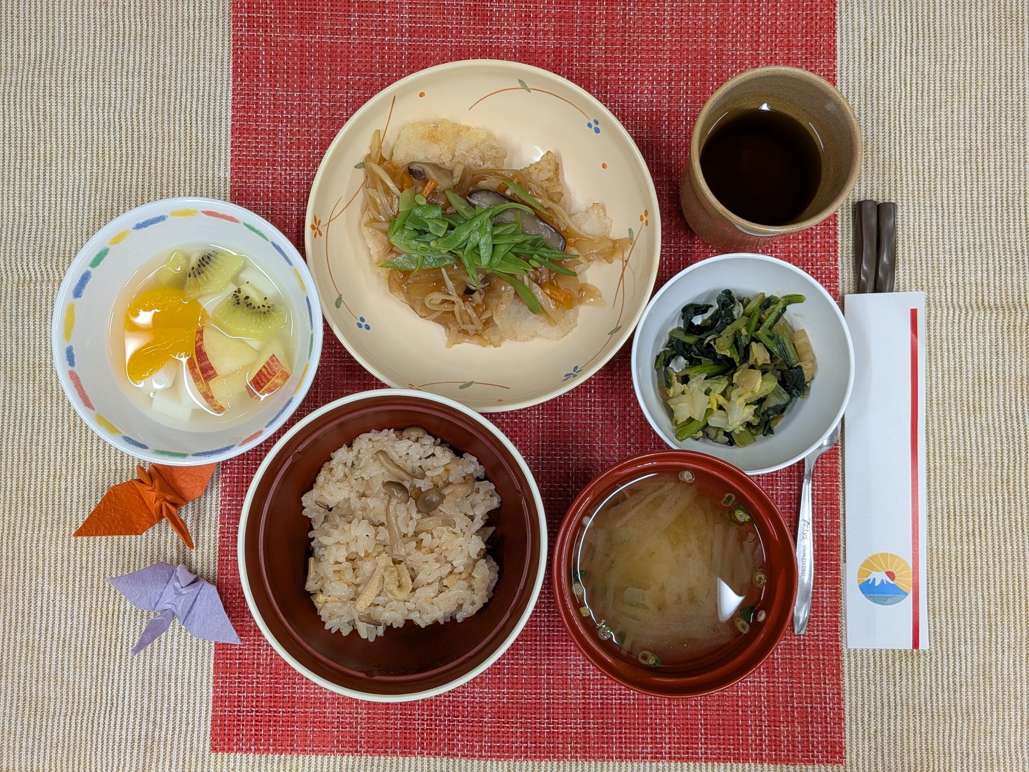 【 1/3(昼) 】しめじご飯・白身魚のあんかけ・和え物・味噌汁・杏仁豆腐(エネルギー621kcal・食物繊維6.8g・塩分2.9g)