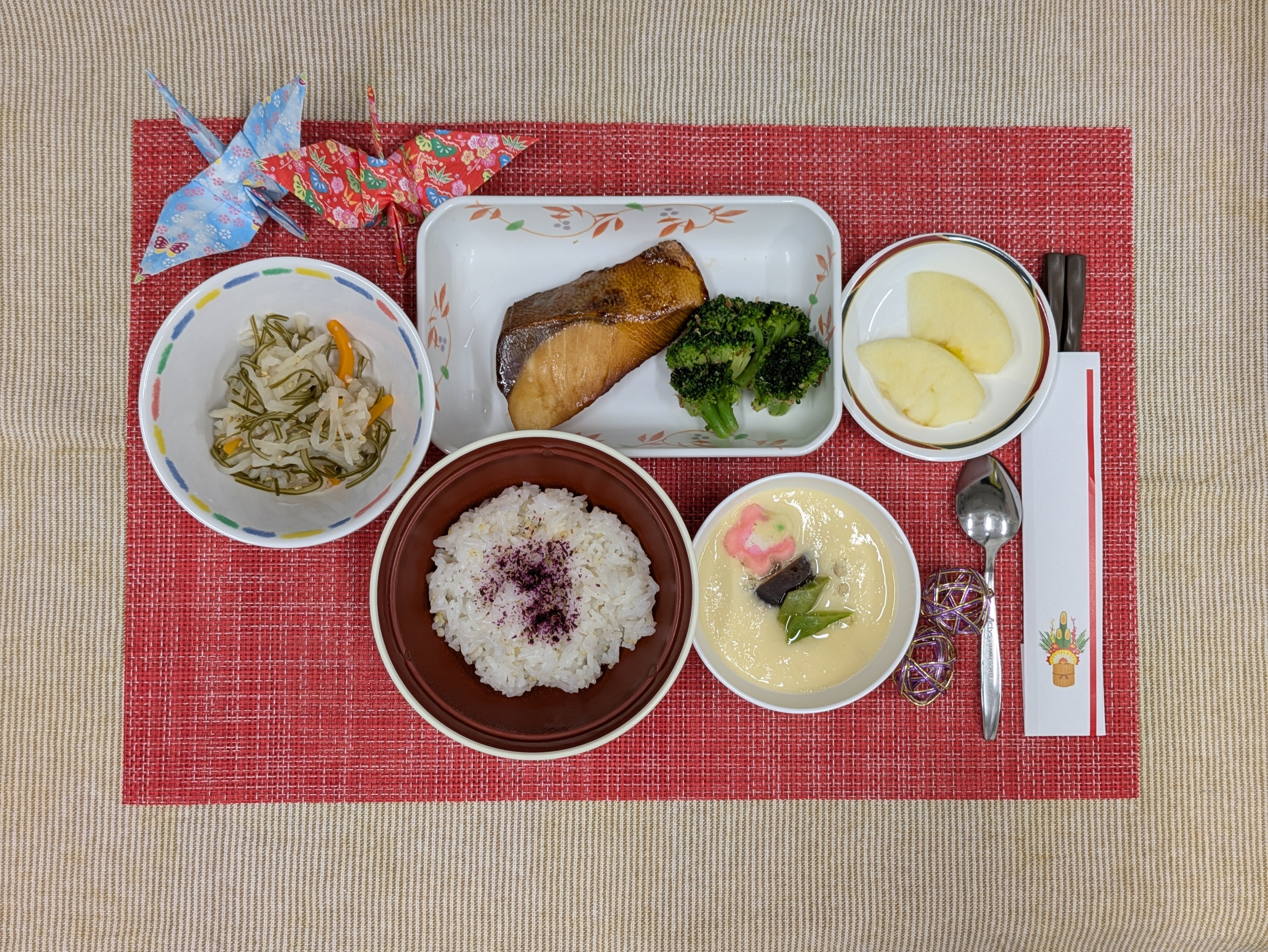 【 1/2(夕) 】ゆかり五穀ごはん・ぶり照焼き・茶碗蒸し・切干大根の酢の物・りんご(エネルギー537kcal・食物繊維5.2g・塩分1.5g)