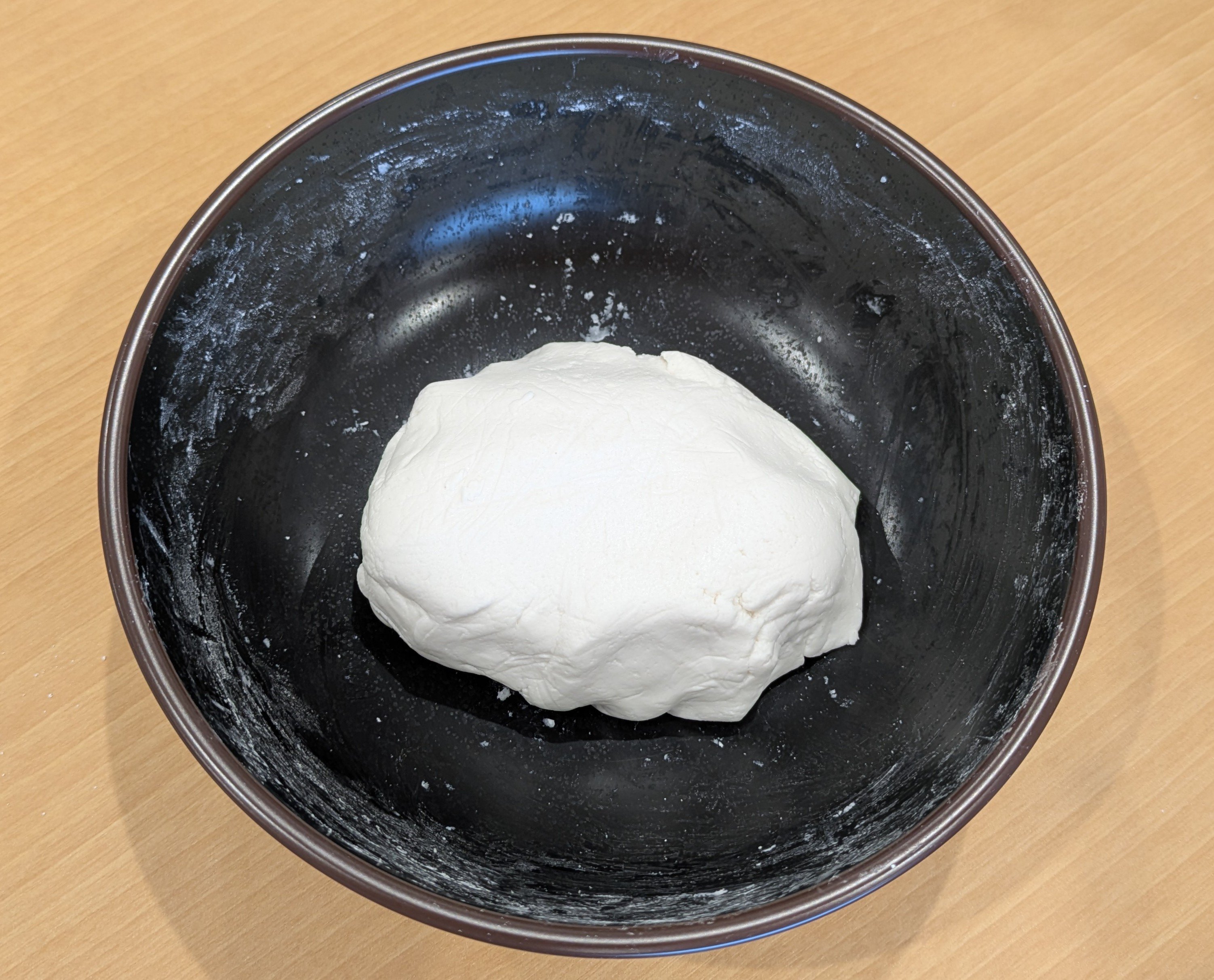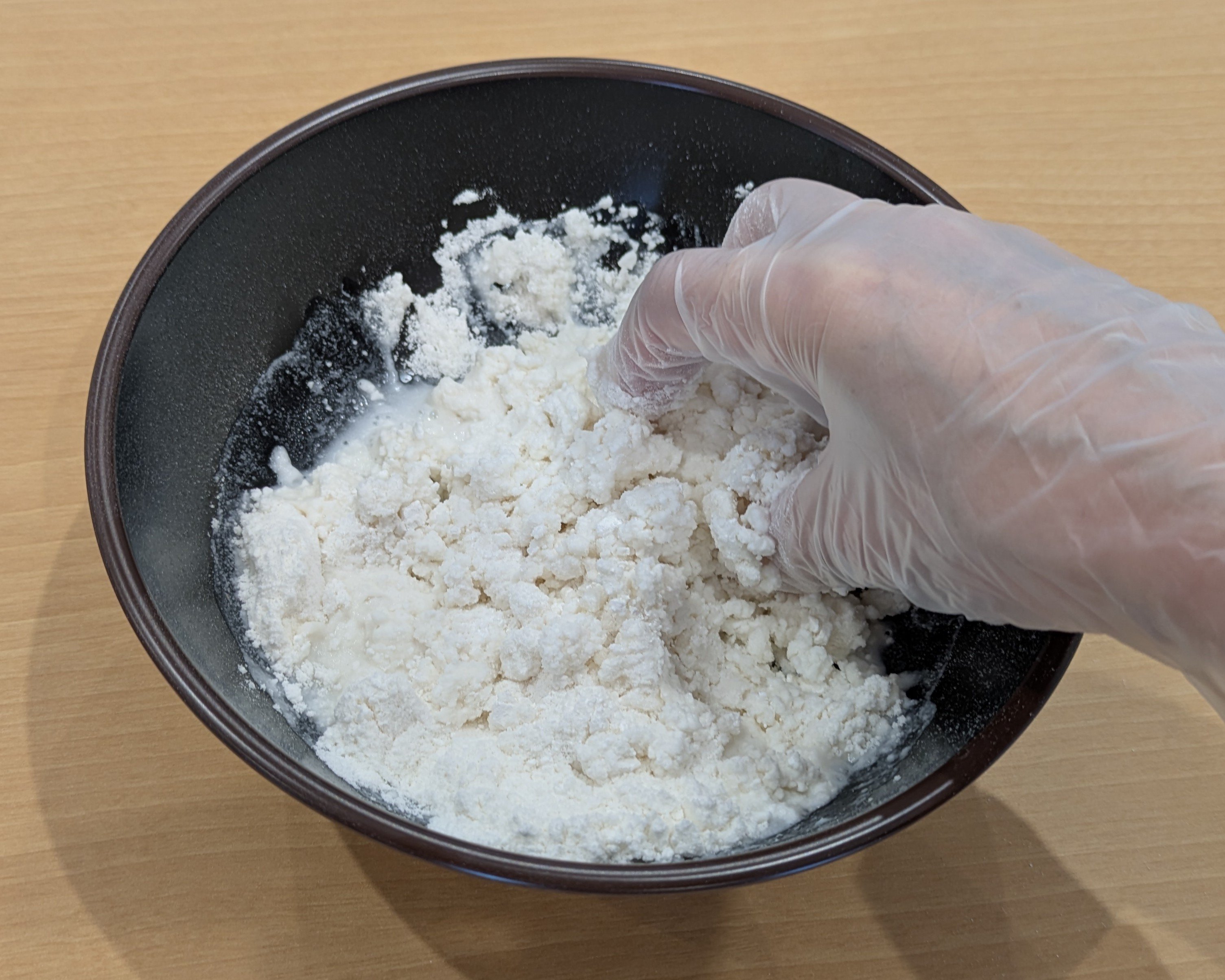 1-2.白玉粉の場合)白玉粉100gに絹ごし豆腐120gを混ぜてよく練る、15個にわけておく(豆腐を混ぜることで軟らかさが保てます。軟らかく、かみ切りやすいので小さなお子さんや高齢の方でも食べやすい団子です)