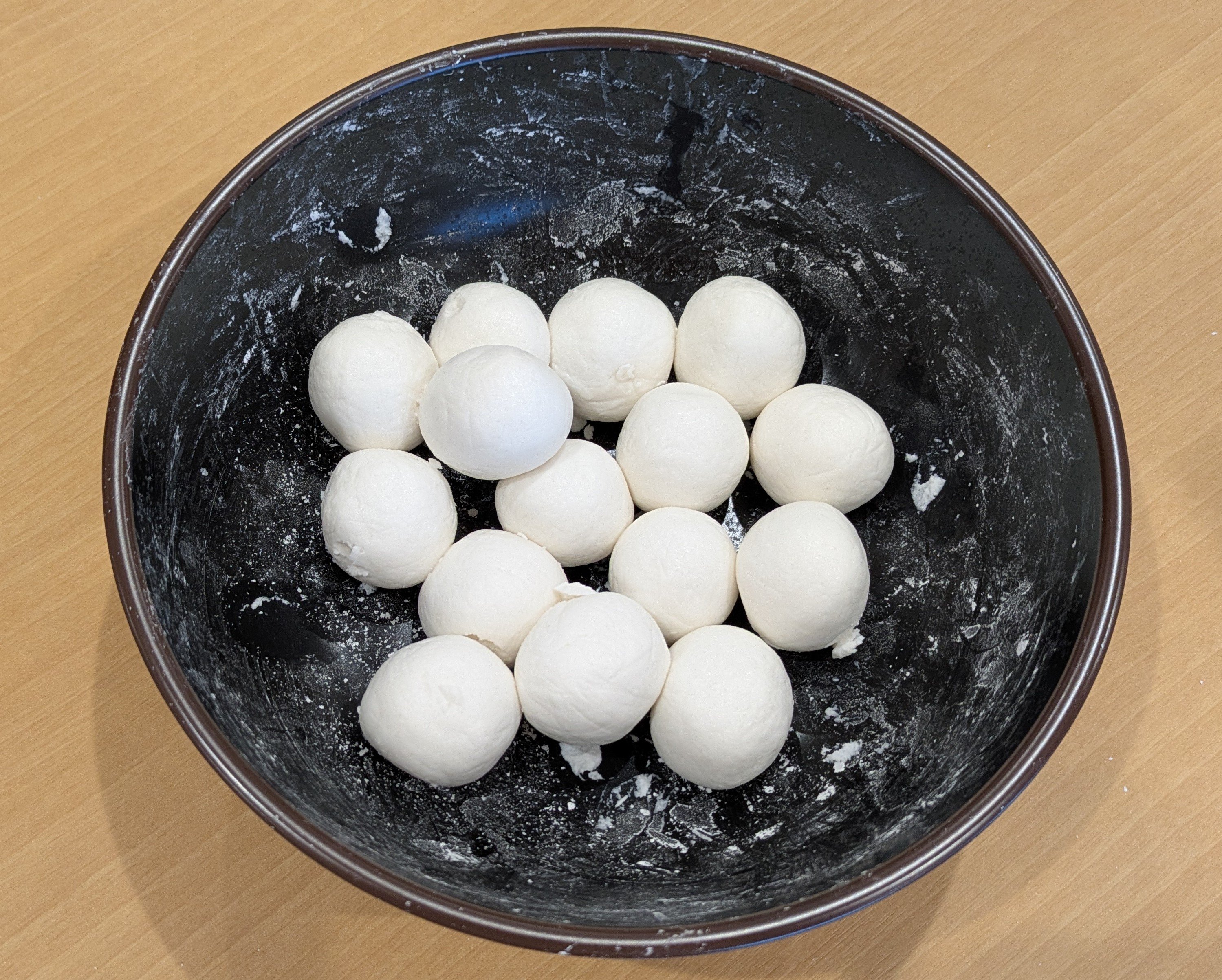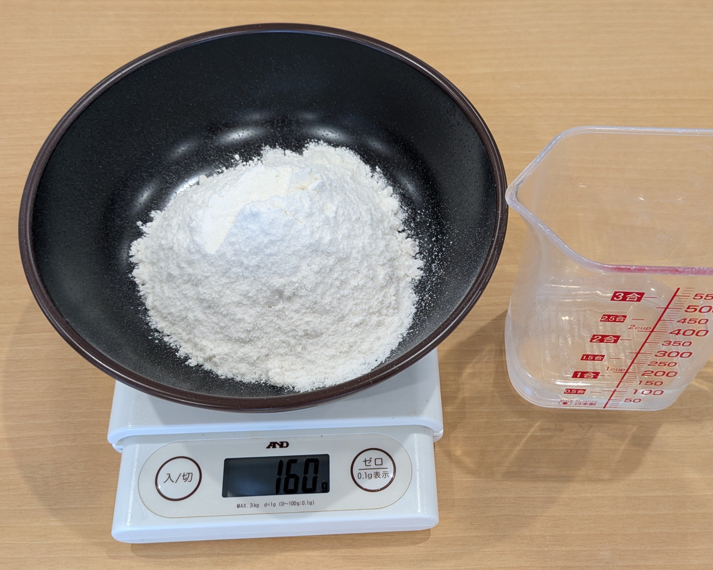 1-1.団子粉の場合)団子粉160gに水100㏄を加えて練る、少しずつ水を加えて練り、耳たぶくらいの硬さになったら15個にわけておく(団子粉が無い場合は白玉粉・上新粉を同量ずつ混ぜても良い)