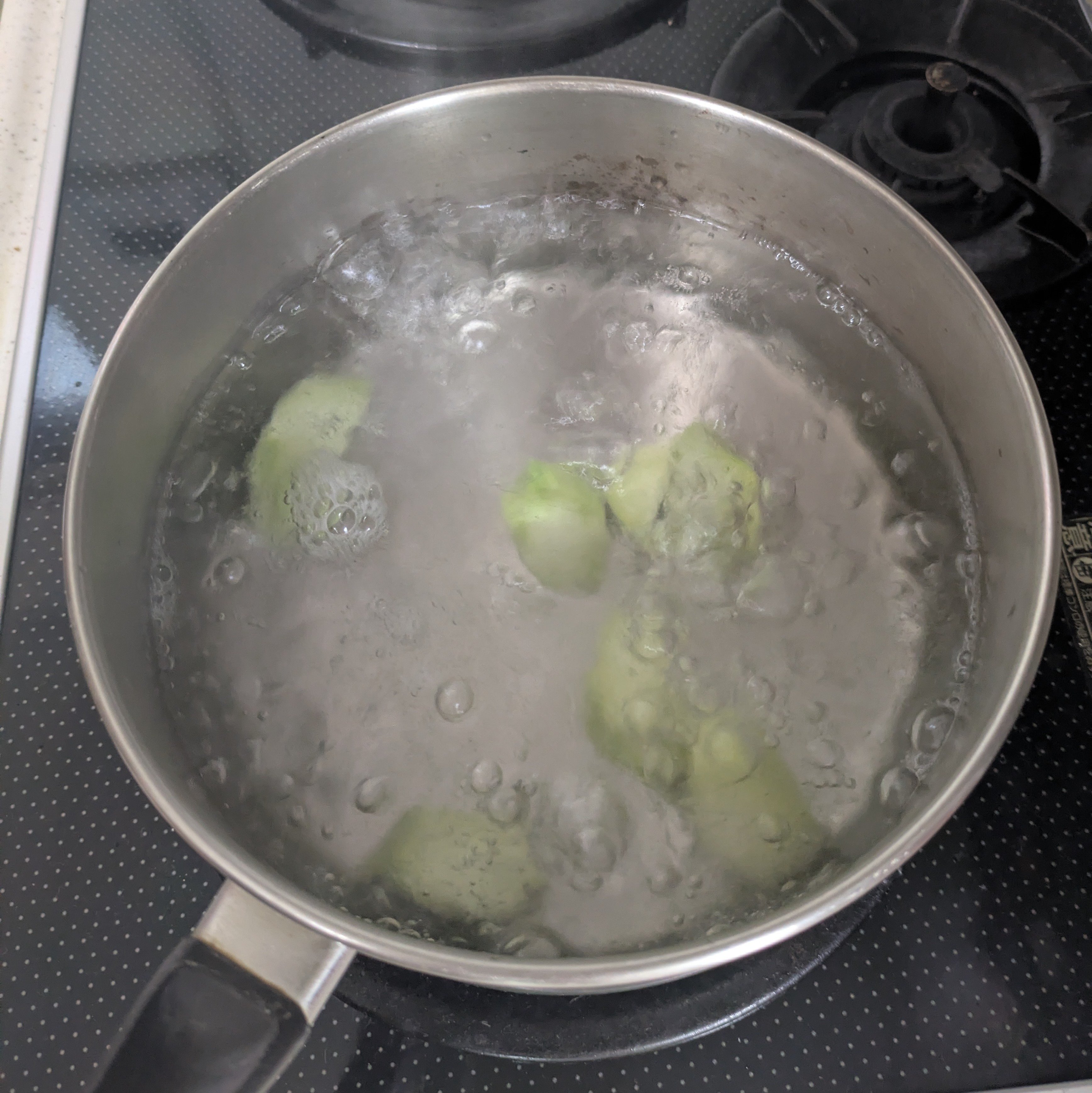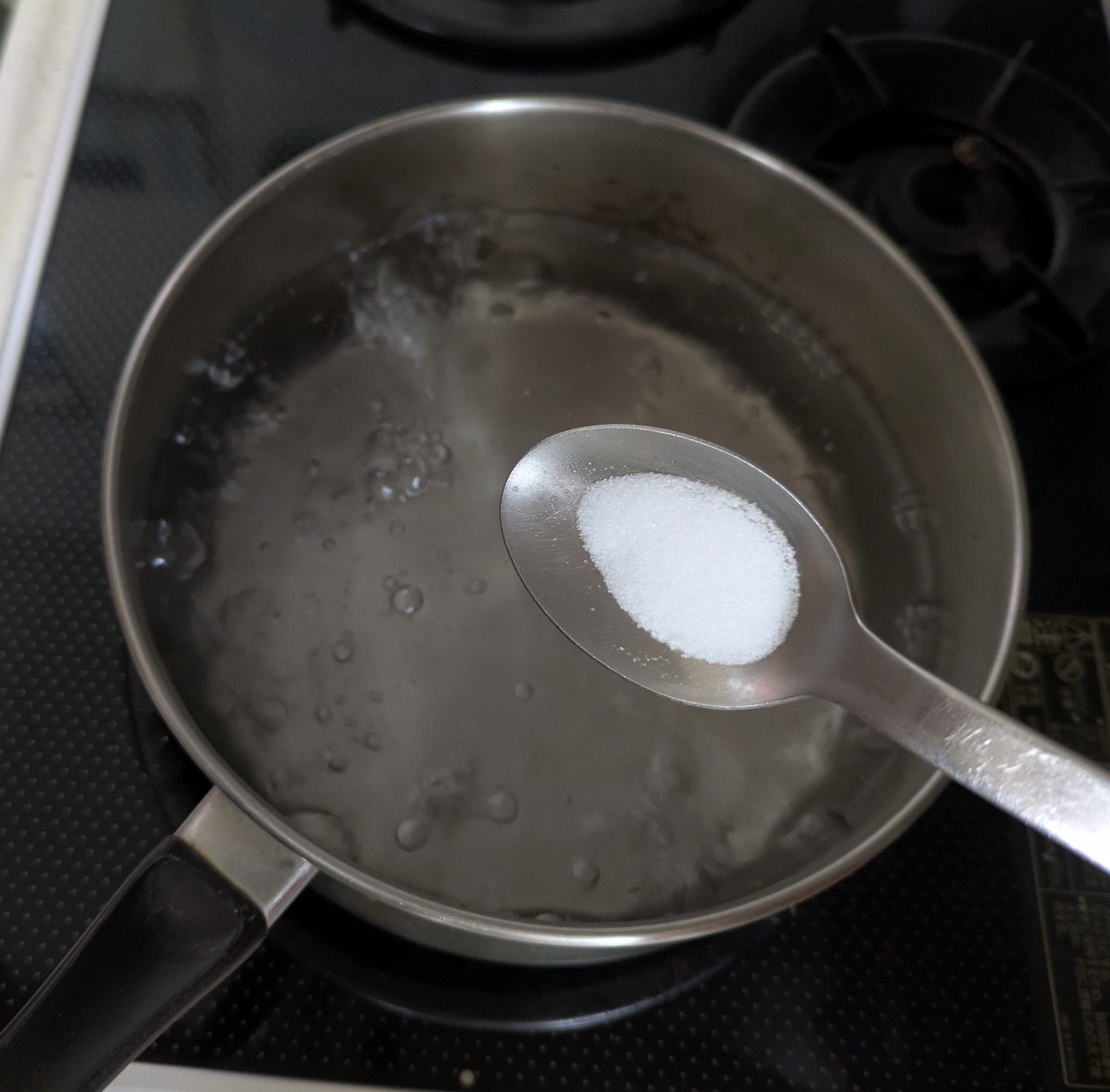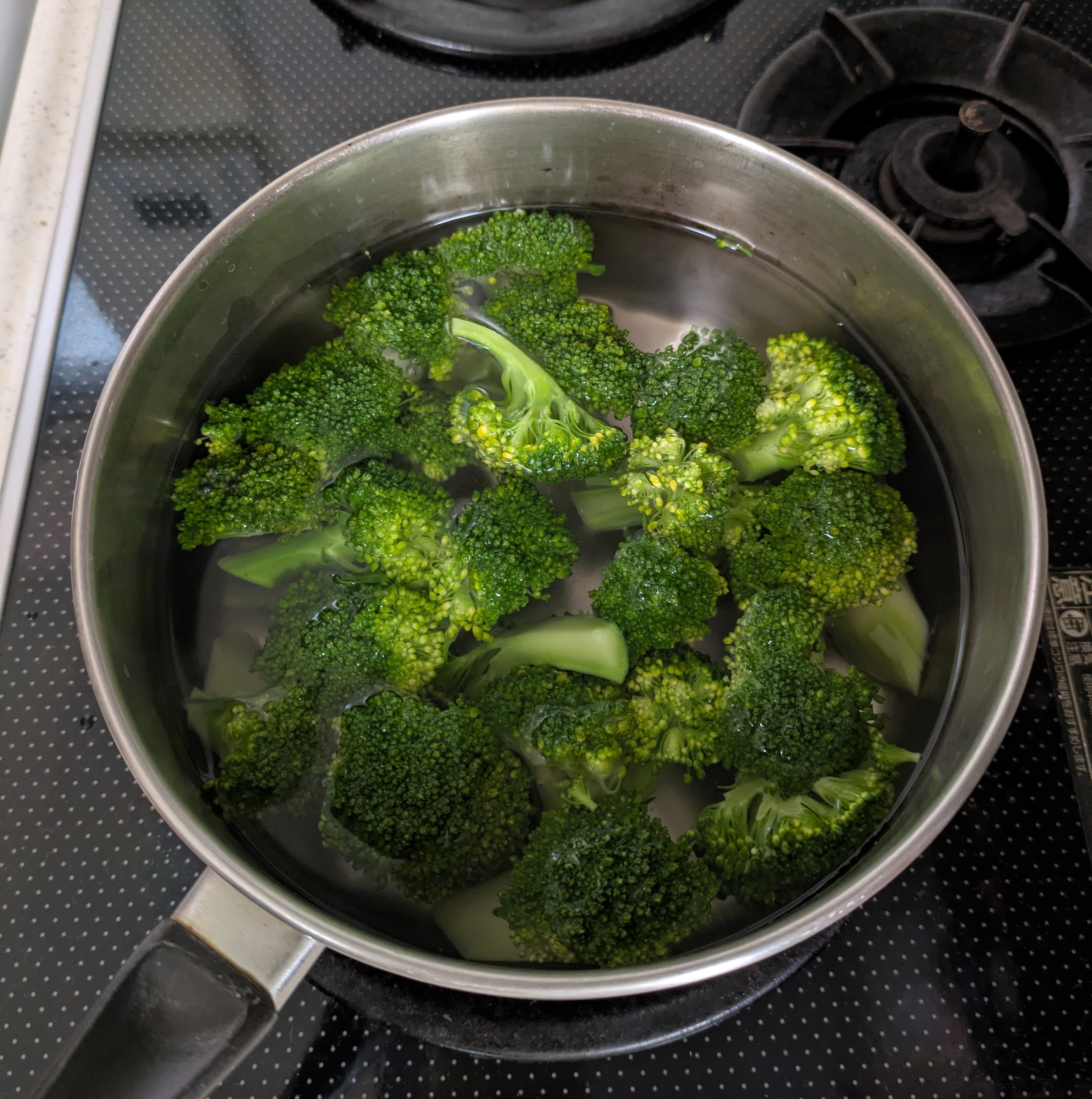 2.茹でる。1で切り分けたブロッコリーが入る大きさの鍋にお湯を沸かす。塩をひとつかみ入れて、ブロッコリーの芯から入れる。10秒くらいしたら房を入れて30秒くらい茹でる。