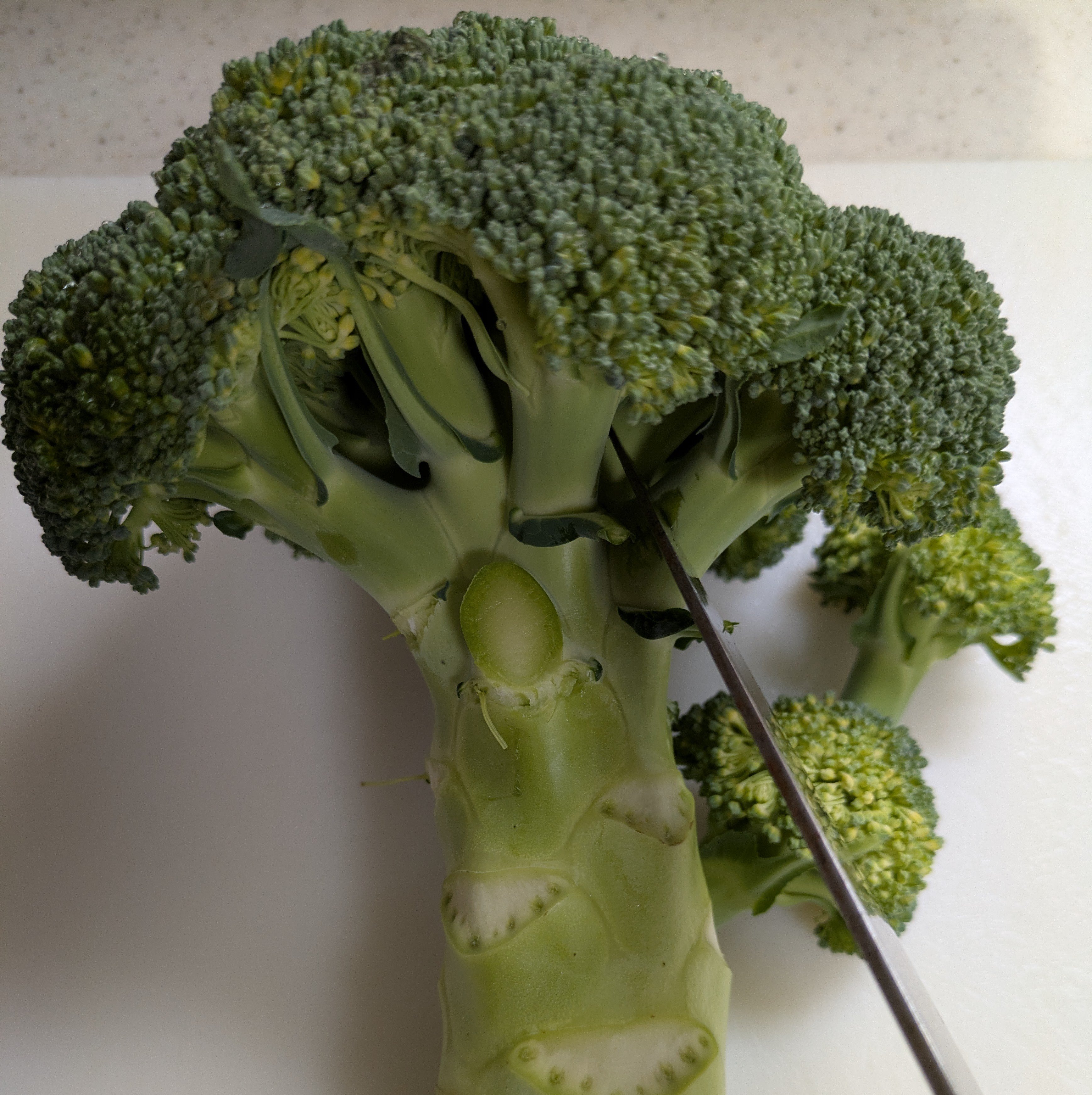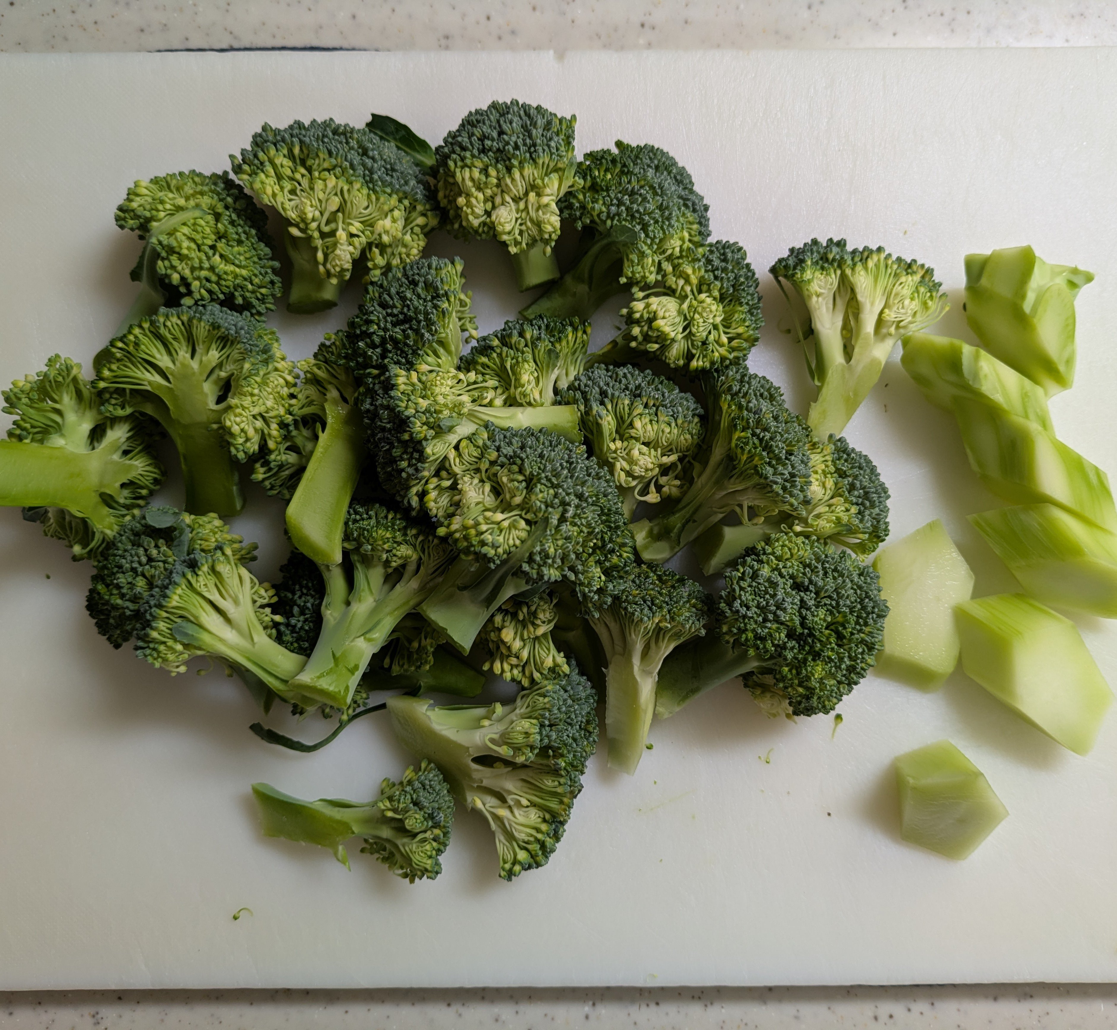 1.ブロッコリーを枝分かれしている房ごとに切り分ける。茎の部分は厚めに皮を剥いて、厚めにスライスする。ボールに入れて流水でざっと洗う。