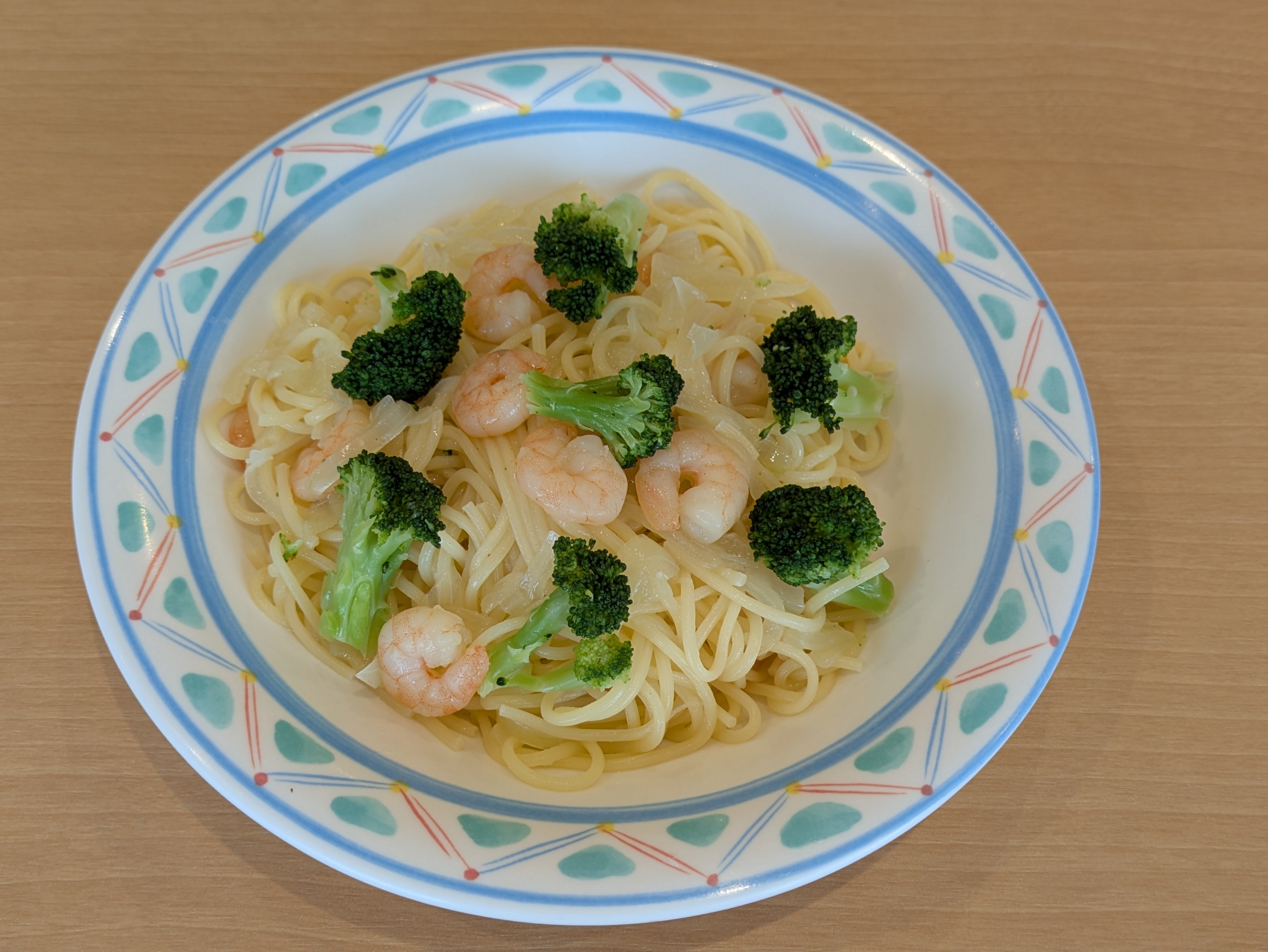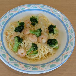 材料)スパゲティ200g・ブロッコリー100g・むきえび80g・玉ねぎ1/2個分・オリーブオイル大さじ1杯・おろしにんにくチューブ0.5㎝・白ワイン大さじ1杯・鶏ガラスープ顆粒小さじ1杯・塩小さじ1/2杯・こしょう少々
