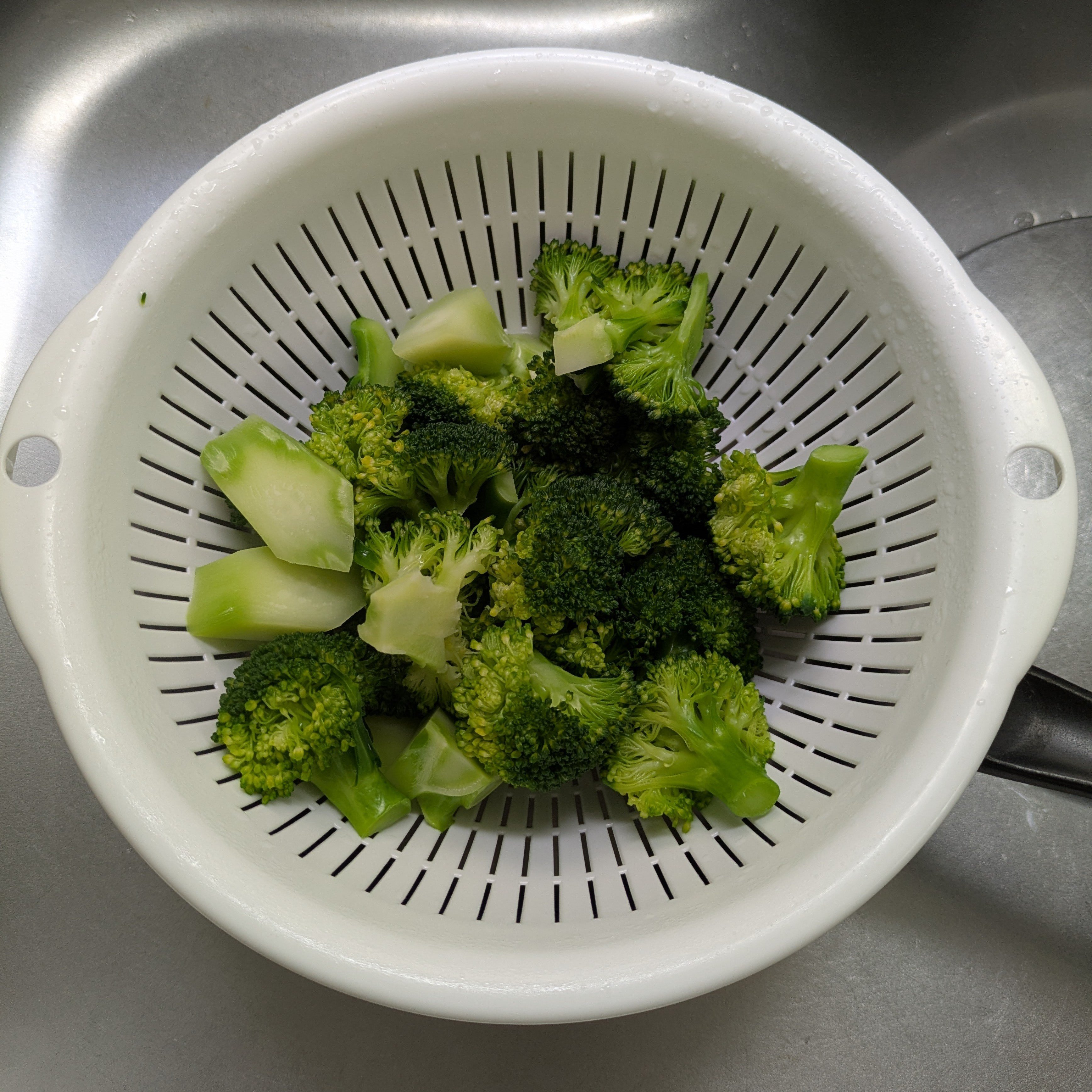 3.ザルにあけて湯を切ったら、冷水で冷ます(ブロッコリーの緑がきれいに保てます)。熱々がお好みの場合は、冷まさず食卓へ。