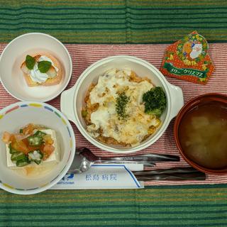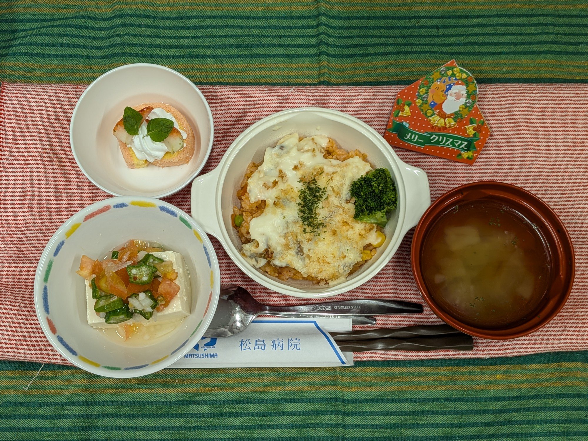 【 クリスマス 】ドリア・豆腐サラダ・コンソメスープ・ミニケーキ (エネルギー755kcal、食物繊維7.2g、塩分3.3g)