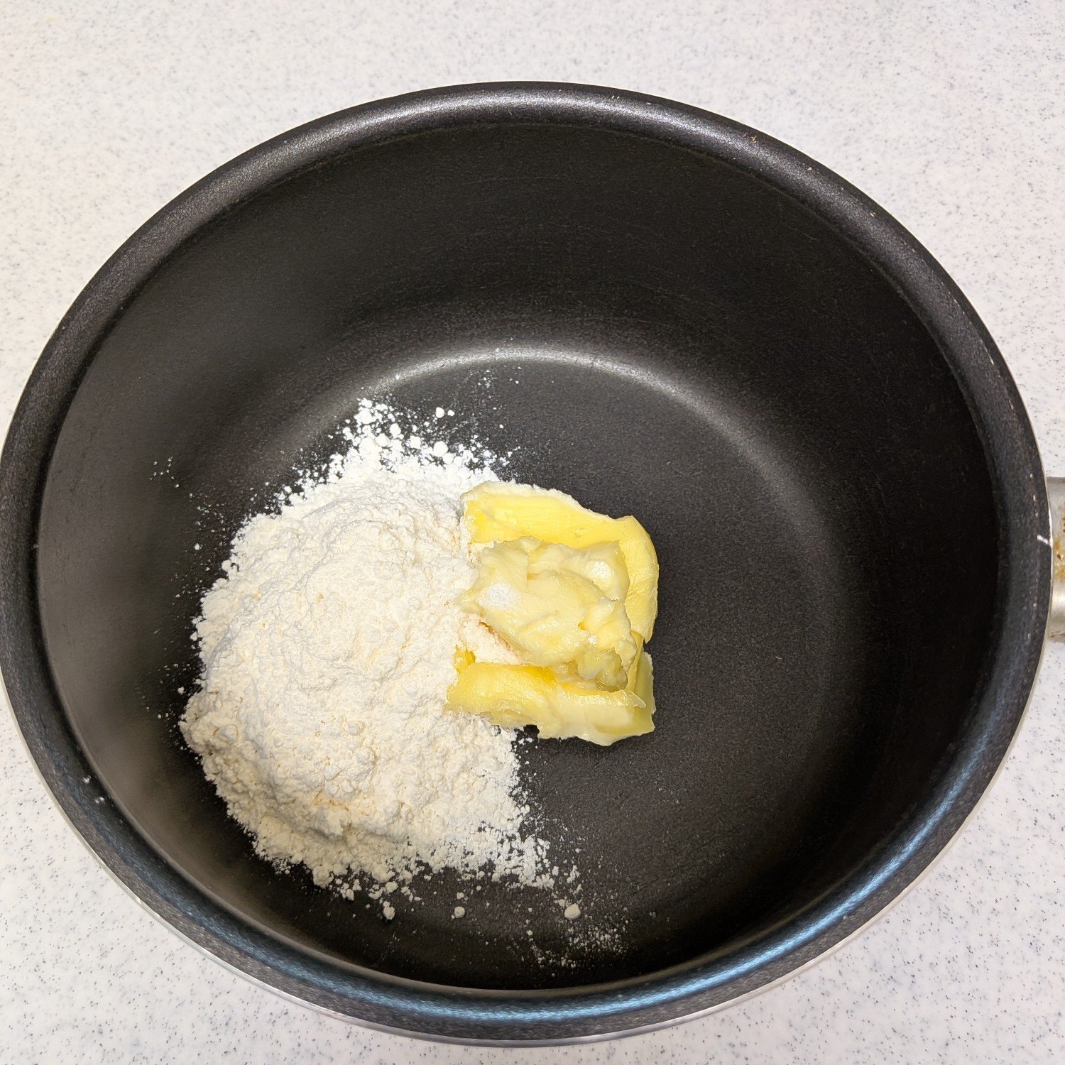 1.深めの鍋に小麦粉とバターを入れて弱火~中火で炒める。小麦粉が油にしっかりなじんでブクブクするくらいまで。*焦げないように注意しましょう。