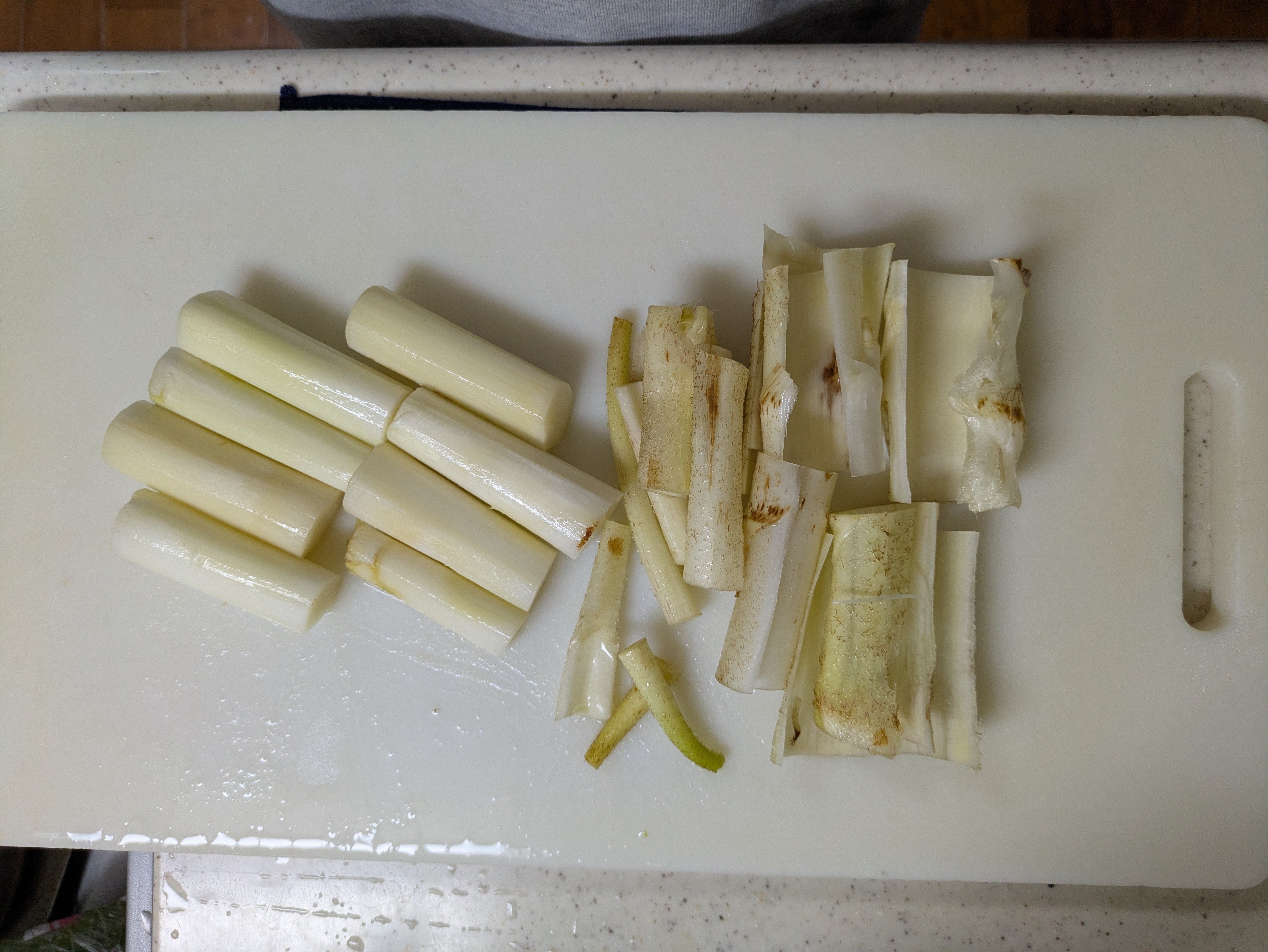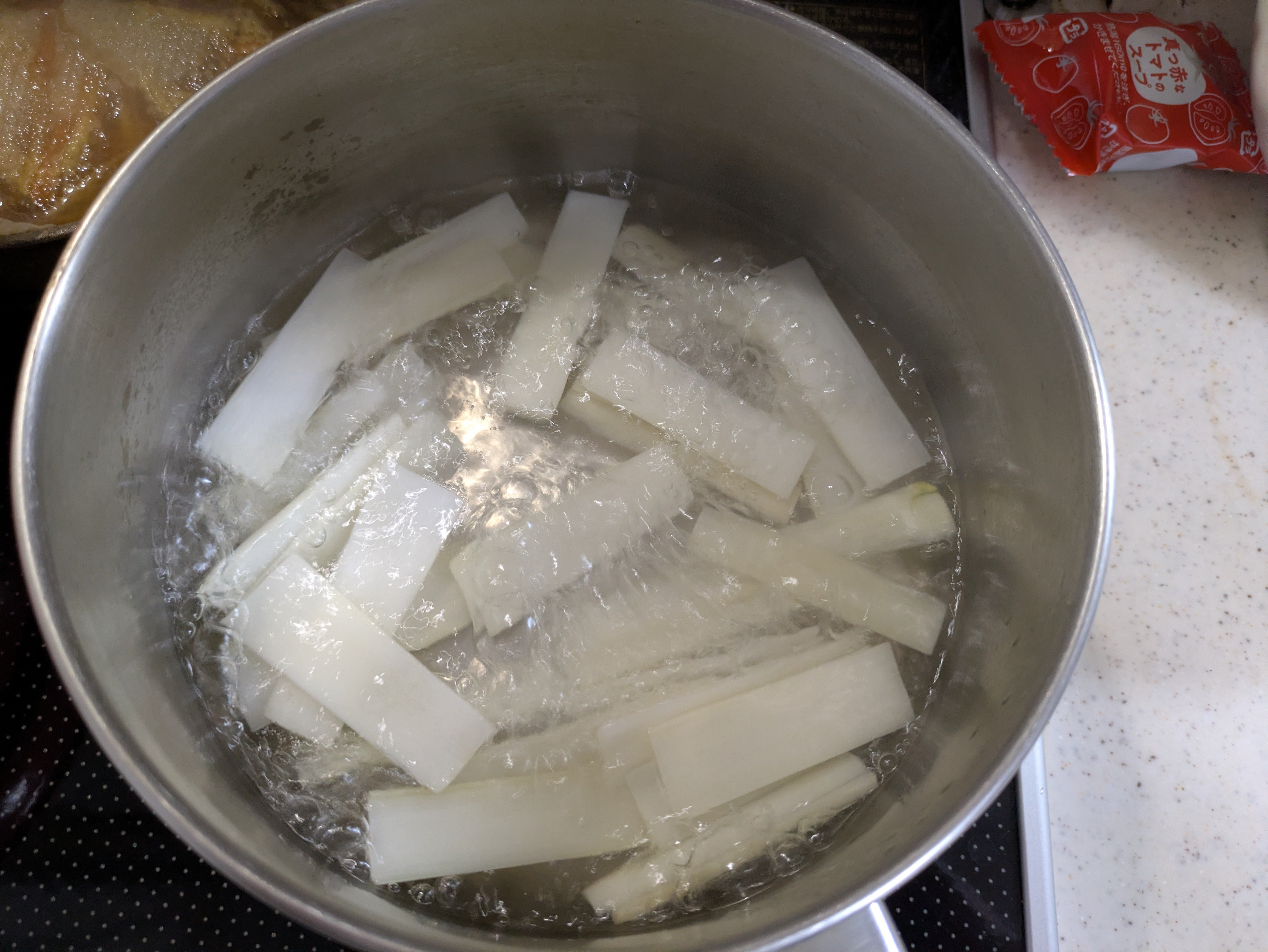 3.うどを茹でる)1で切ったうどを沸騰した湯で茹でる。(苦みが気になる方は長めに茹でると良いでしょう)。冷水にとって、冷ます。
