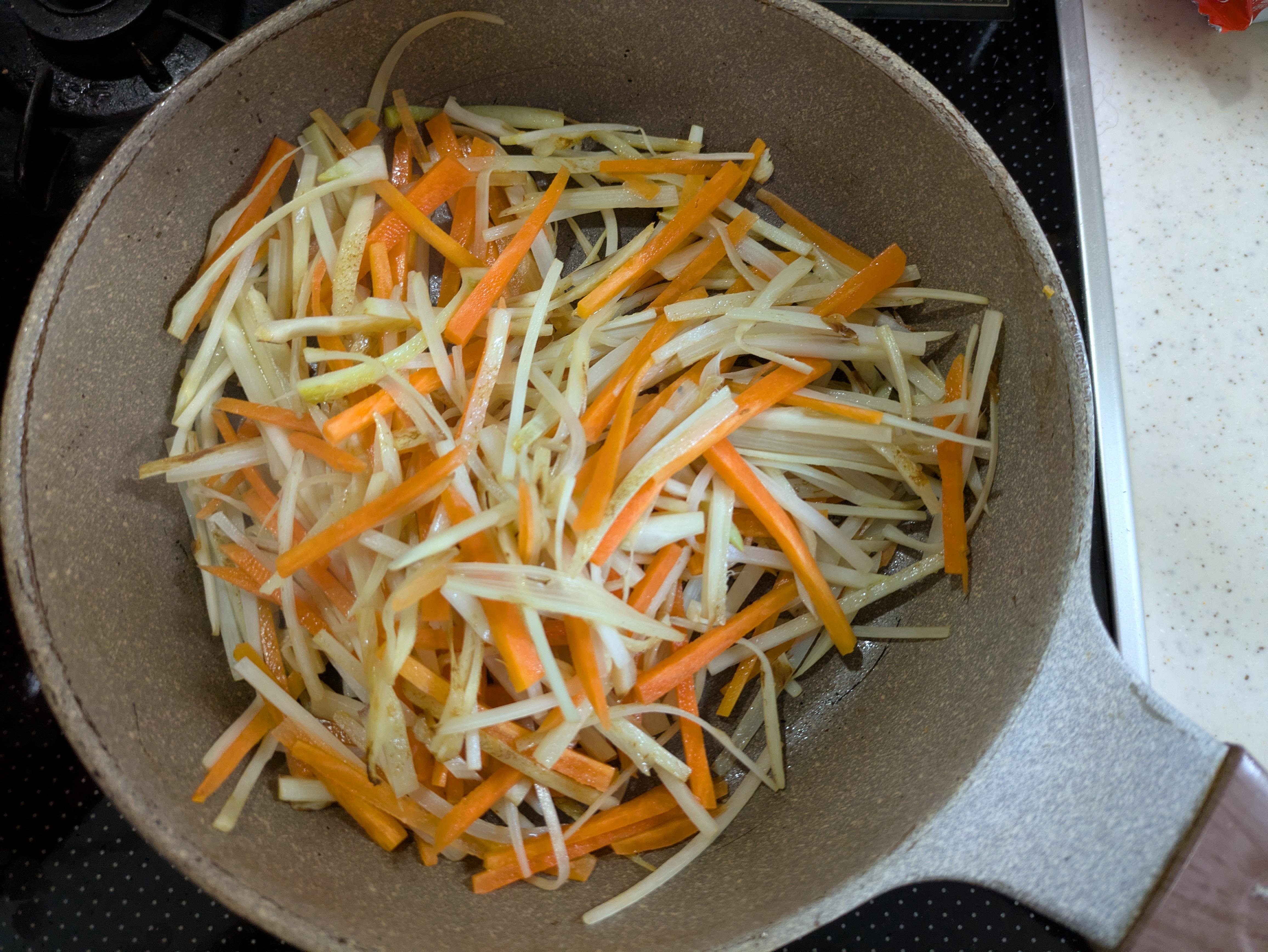 2.鍋にごま油を入れ、酢水を切ったうどの皮・にんじんを入れて炒める。ごま油が全体に混ざったら、醤油・砂糖・みりん・料理酒・だし汁を入れて煮る。