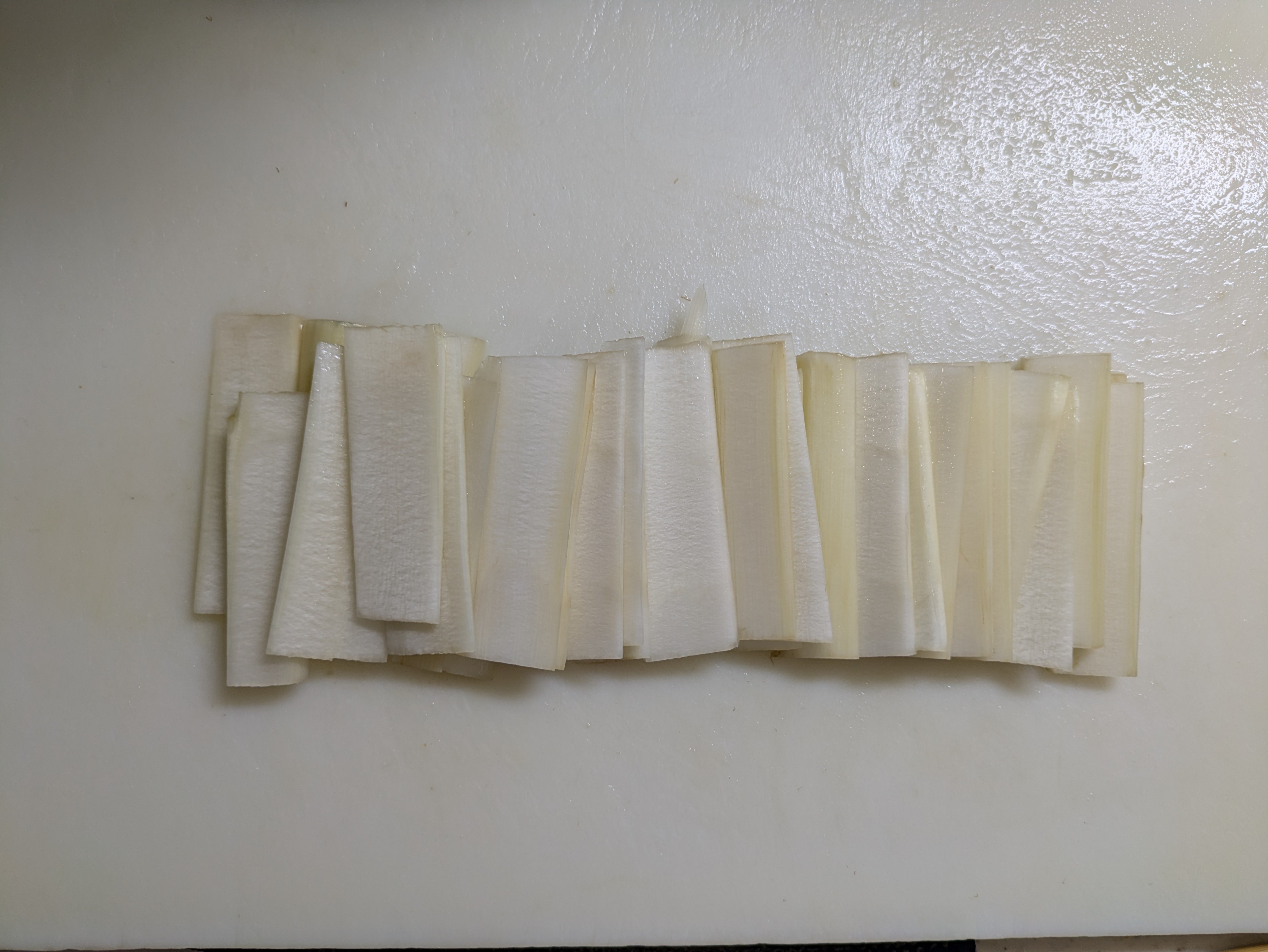 1.うどの下処理)酢水を用意する(材料外、水2カップに対して酢大さじ1杯程度)。うどをよく洗い、5cmほどの長さに切って、皮を剥く。縦にスライス切りにする。(うどはアクが強いため、すぐに色が変わってしまうので、切ったらすぐに酢水につけましょう)(うどの皮はきんぴらにするので取っておきましょう)