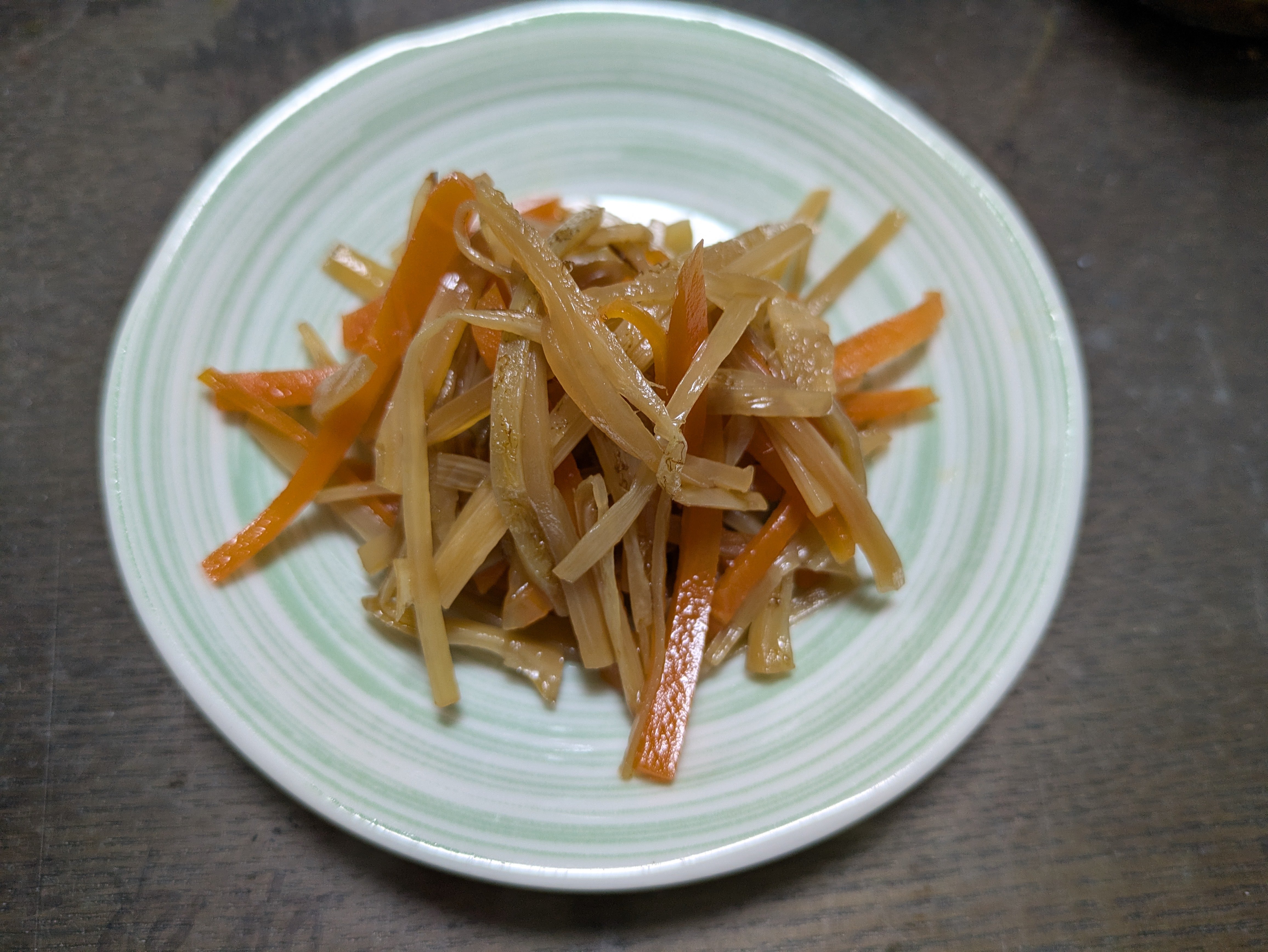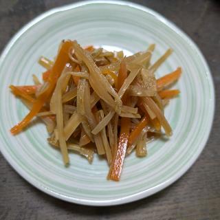 材料:うどの皮1本分・にんじん10g程度・ごま油大さじ1・醤油大さじ1・砂糖大さじ1/2・みりん大さじ1/2・料理酒大さじ1/2・だし汁