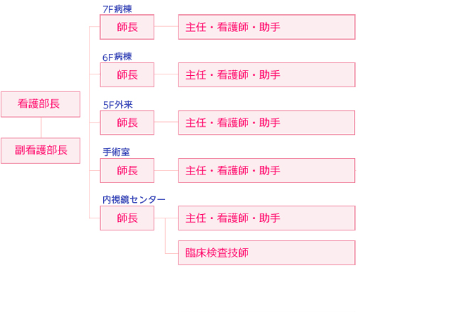 看護方式に 受け持ち制チームナーシング + 一部機能別 を実施しています。